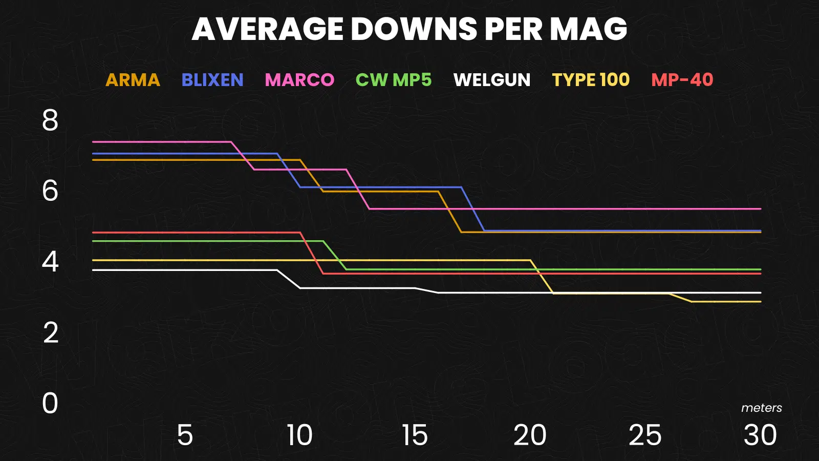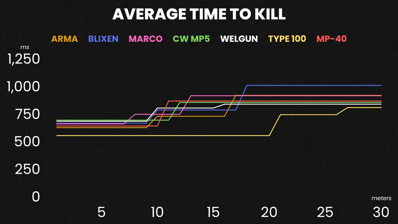 Then, if we look at the others, we have to say that the pack is very tight and depending on the interpretation any of those guns could be considered absolute meta. There is in my opinion one SMG that might be actually better than the Marco 5 and the others: the Armaguerra 43. Best time to kill until 16 meters (except for small range from 9 to 12)and then almost identical to the Marco 5.